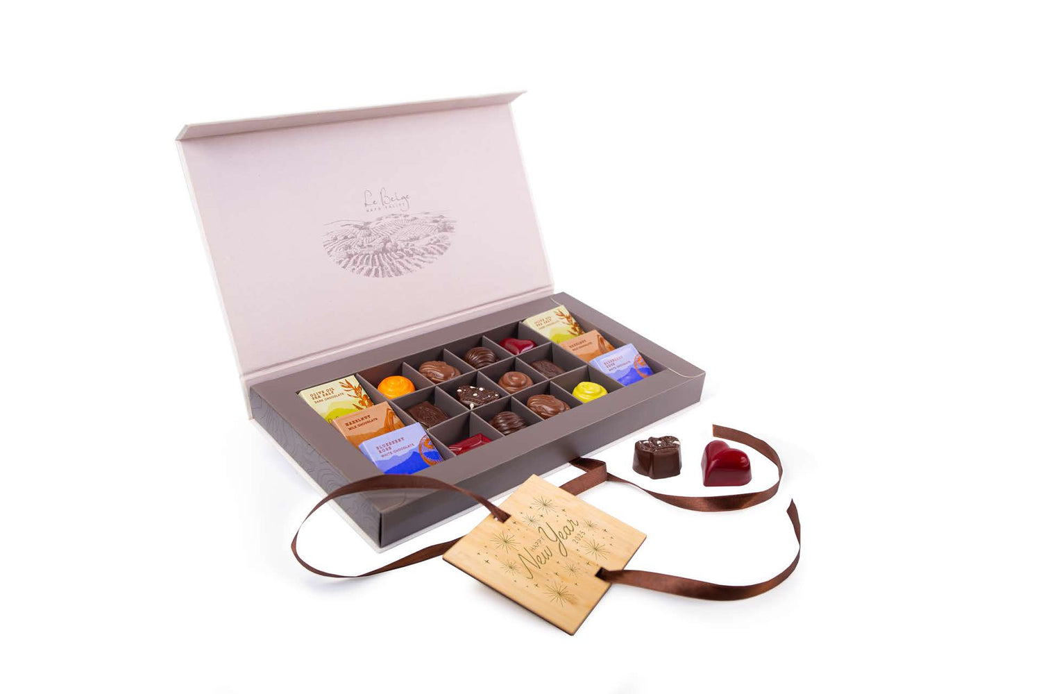 Gift our New Year's Eve 18 piece Galleria Chocolate Collection this new year! The collection features several decadent chocolate tablets and truffles, and includes a "Happy New Year 2025" hot stamp. Chocolate tablet flavors include: 2 Dark Olive Oil Sea Salt, 2 White Blueberry Rose, 2 Milk Hazelnut Gianduja & Crepe. Truffle flavors may include a variety of: White Chocolate Key Lime Ganache, Milk Chocolate Hazelnut Praline with Cinnamon Ganache, White Chocolate Passion Fruit Ganache, Dark Chocolate Raspberry Ganache, Dark Chocolate Dark Ganache, Milk Chocolate French Vanilla Ganache, Dark Chocolate with Cognac Ganache, and Milk Chocolate Caramel Sea Salt.