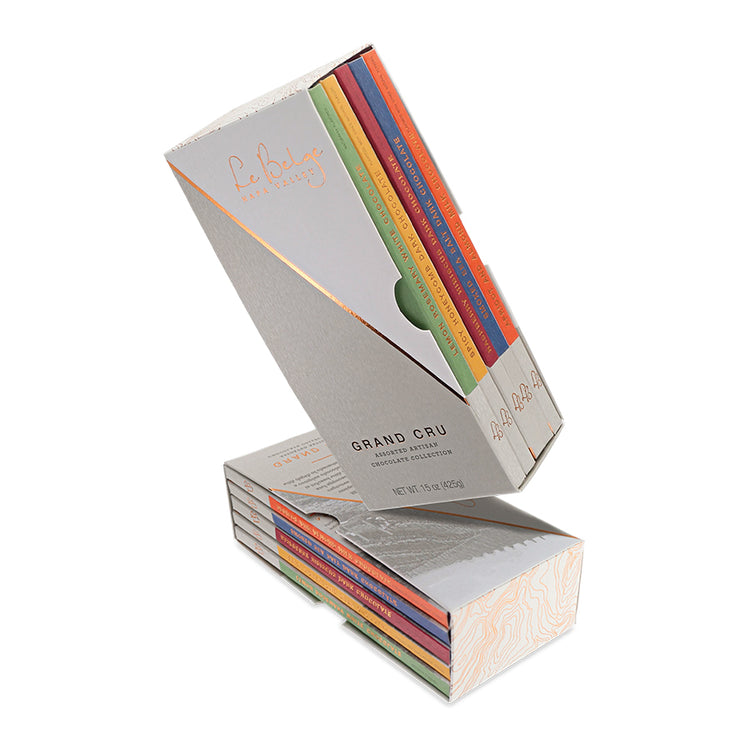 Grand Cru Library Collection Box- 5pc set features one of each of the five 3oz bar varieties: White Lemon Rosemary, Dark Smoked Sea Salt & Cacao Nib, Milk Apricot Almond, Dark Raspberry Hibiscus, and Dark Spicy Honeycomb.